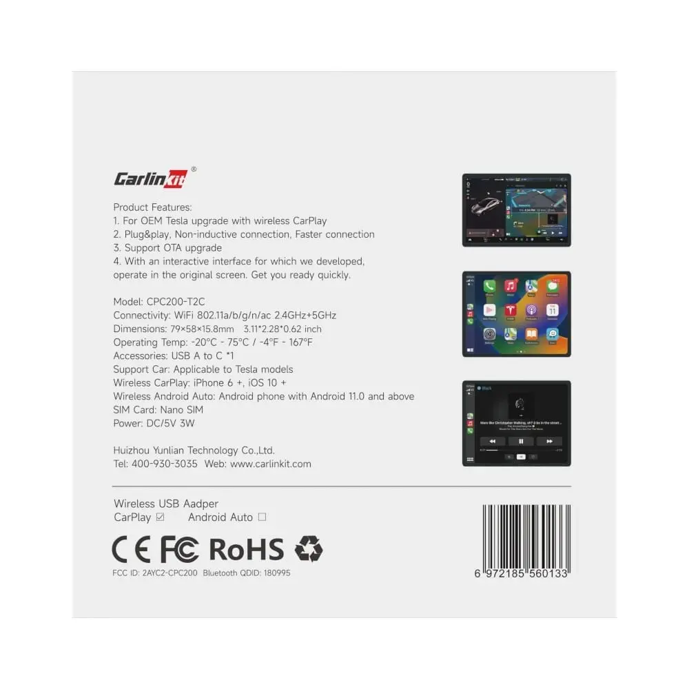 Carlinkit Tesla (T2C) / Тесла - это компактный usb-адаптер который позволяет вам получить полноценный беспроводной Apple CarPlay или Android Auto без необходимости подключать телефон по кабелю в usb гнездо вашего автомобиля!